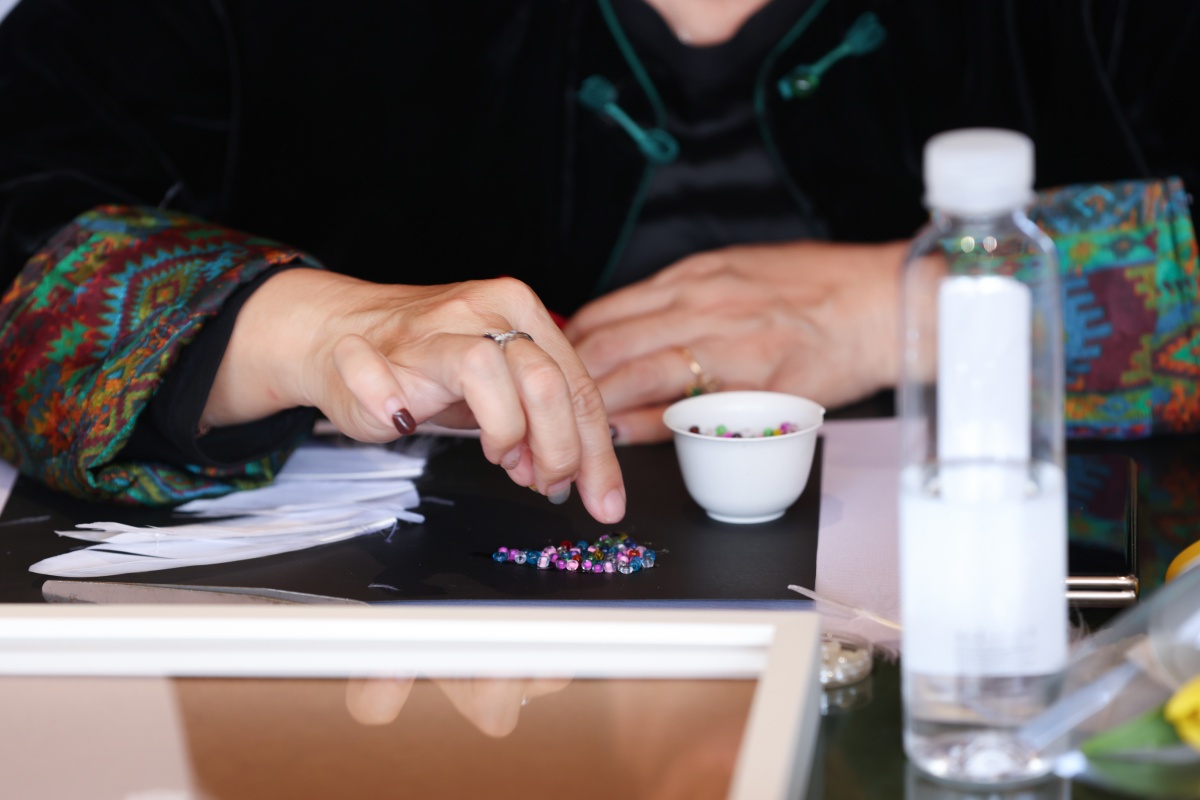 在老师指导下,客户们亲手将晶莹的水晶片、羽毛与各色珠饰巧妙组合。