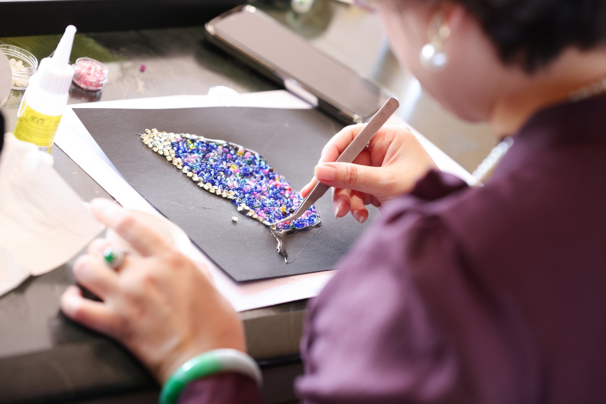 在老师指导下,客户们亲手将晶莹的水晶片、羽毛与各色珠饰巧妙组合。